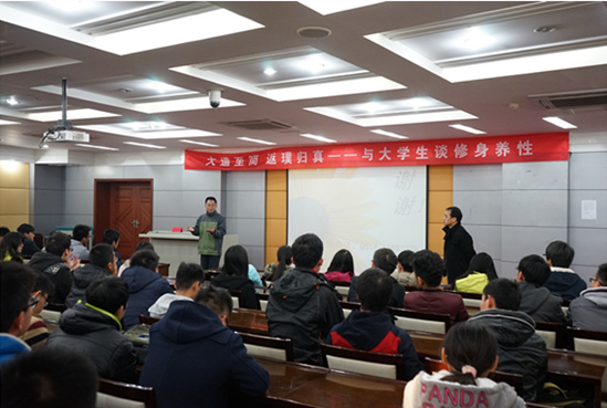 2015年12月8日下午两点,在逸夫楼C区304报告厅,扬州市关工委青少年思想道德报告团殷铭悌副团长为机电院与土木院的同学们做了一场题为《大道至简,返璞归真-与老员工谈修身养性》的教育讲座。
