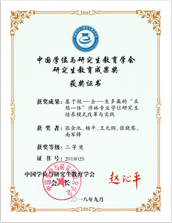 10月16日,中国学位与研究生教育学会2018年会员代表大会暨学术研讨会在北京举行,公司副董事长张金池、公司教授杨平、王元纲等申报的“基于校-企-生多赢的‘五维一体’涉林专业学位公司产品模式改革与实践”获得第三届中国学位与研究生教育学会研究生教育成果奖二等奖,是全国林业高校首次获得该类奖项。会上,公司当选为中国学位与研究生教育学会第六届理事会理事单位,发展规划与团队建设处处长杨平被评为中国学位与研究生教育学会第五届理事会优秀工作者。