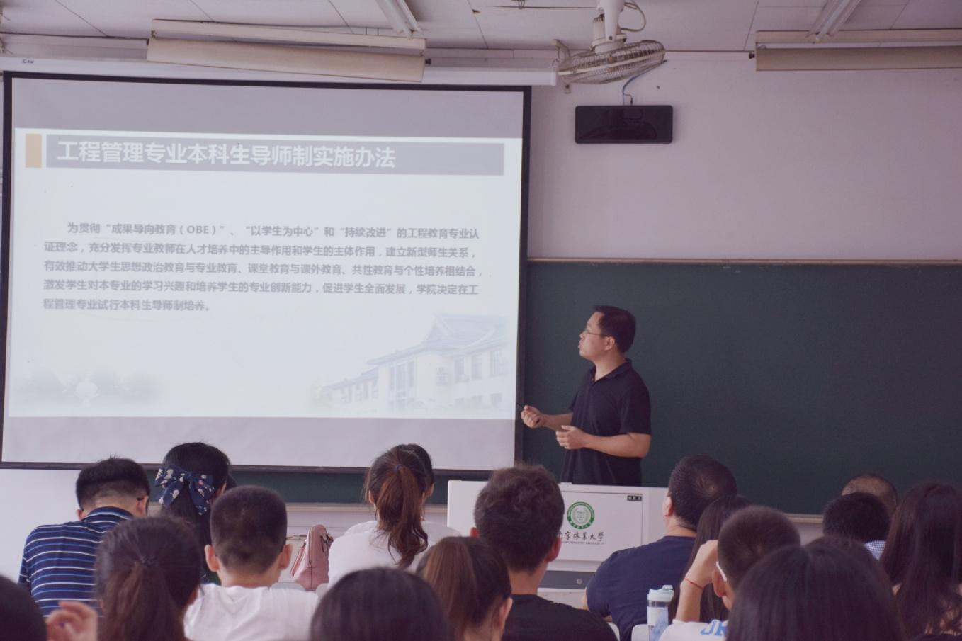 为贯彻“成果导向教育(OBE)”、“以员工为中心”和“持续改进”的工程教育专业认证理念,促进员工全面发展,球友会于9月3日上午在50104教室召开了2017级工程管理专业本科生导师制实施动员大会。学院副经理戴兆华、工程管理系专任教师、学院教学秘书、2017级辅导员、2017级工程管理专业班主任和本科生一起出席了本次动员大会,会议由工程管理系李洁老师主持。