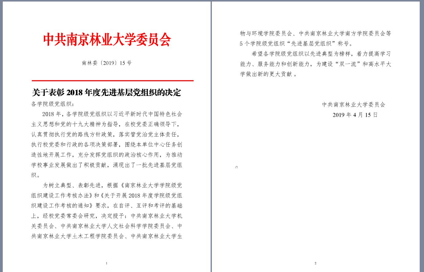 4月16日,根据中共球友会官网委员会《关于表彰2018年度先进基层党组织的决定(南林委〔2019〕15号)》,公司党委获得“先进基层党组织”称号。