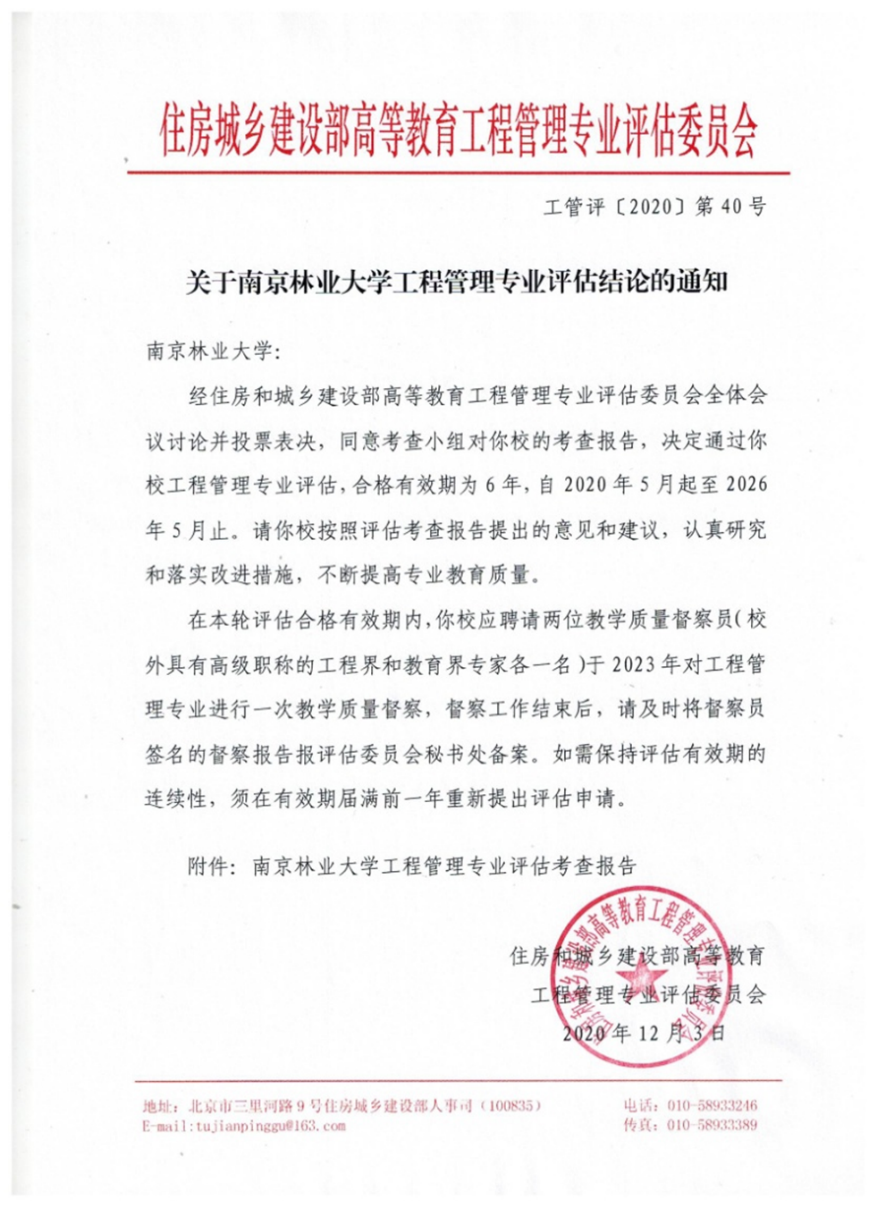 12月3日住房城乡建设部高等教育工程管理专业评估委员会正式发布《关于球友会官网工程管理专业评估结论的通知》(工管评[2020]第40号),公司工程管理专业顺利通过专业评估,有效期为6年,自2020年5月起至2026年5月止。