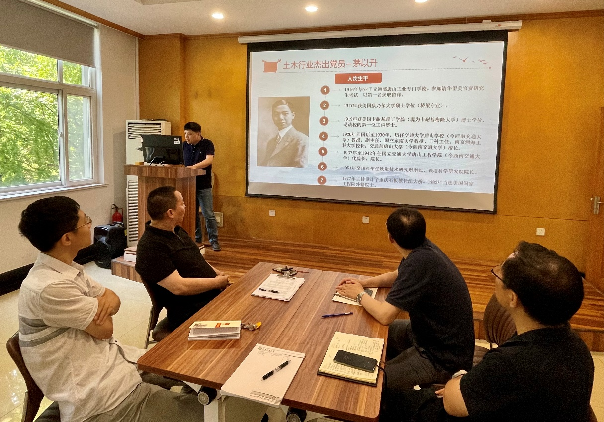 土木公司党委委员、副经理李强为支部全体成员上题为《学楷模奋斗精神,做新时代建设者》的专题党课。李强讲述了桥梁专家茅以升、港珠澳大桥岛隧工程总工程师林鸣、地震工程专家刘恢先、东方路桥集团党委书记丁新民和任容城县住房和城乡建设局副局长刘戴维的故事。他说:“2021年是中国共产党百年华诞。中国站在“两个一百年”的历史交汇点,全面建设社会主义现代化国家新征程即将开启。身为土木工程相关从业人员,应发扬工匠精神、大国精神,向土木行业杰出共产党员学习。”