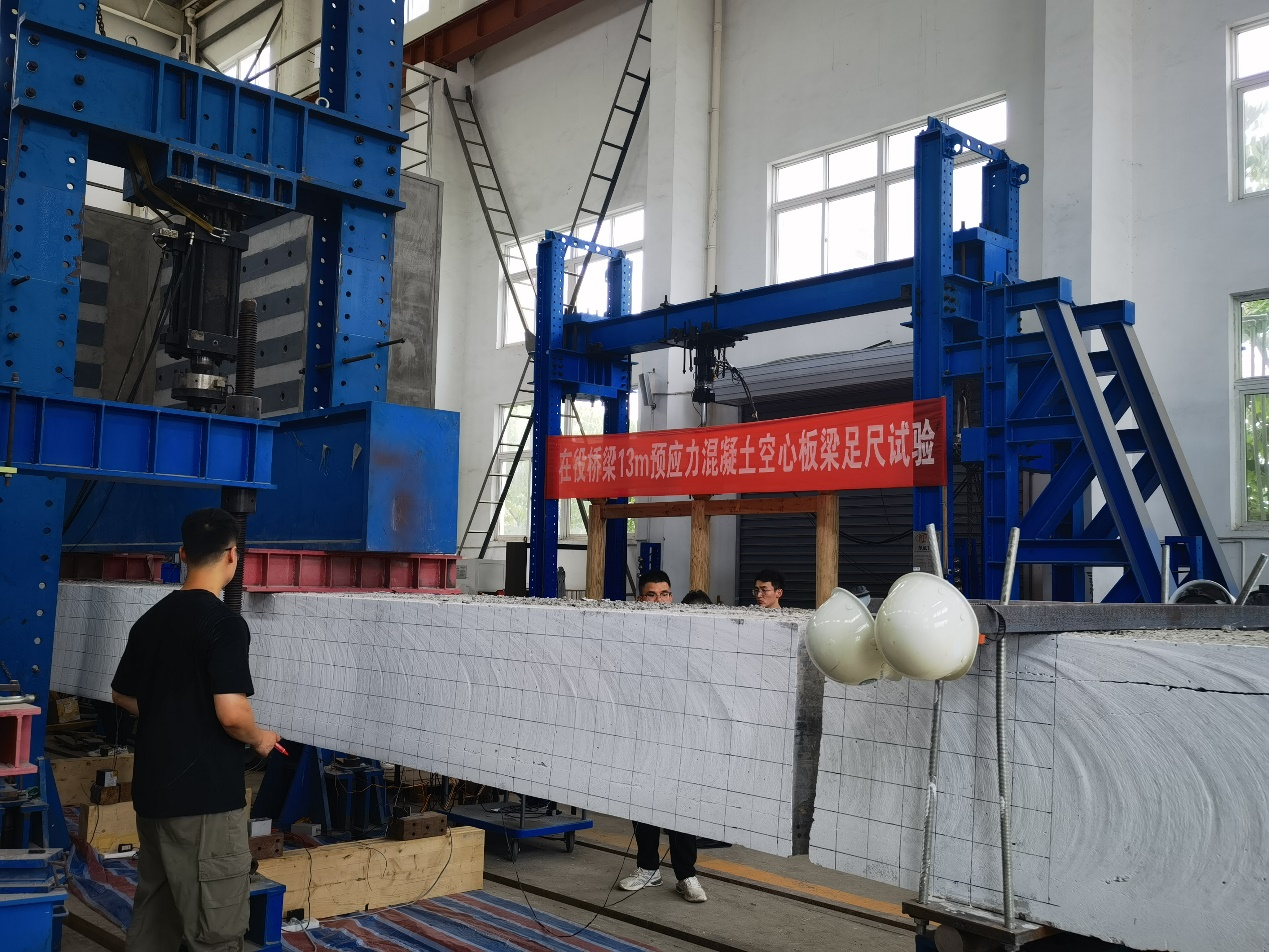 试验通过对多根13m预应力空心板梁进行极限抗弯加载,研究在役预应力混凝土空心板梁受力退化行为。通过足尺空心板梁残余承载能力试验,分析了试验梁的荷载与挠度、应变对应关系,以及承载过程中的裂缝发展形态等;并精细化考虑在役桥梁实际工程情况,包括桥面铺装、铰缝混凝土对承载力的实际贡献,系统分析其残余抗弯极限承载能力及刚度退化,得出在役空心板梁受力性能及破坏机理。