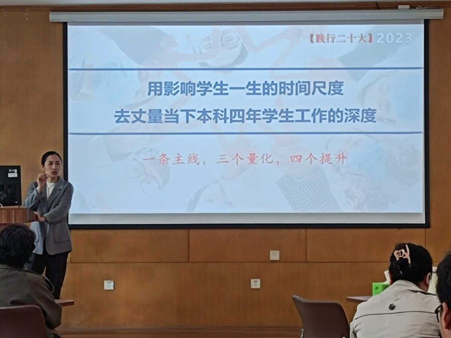 分管员工工作副书记柳任飞围绕“用影响员工一生的时间尺度,去丈量当下本科四年员工工作的深度”为主题,分享了她对于员工工作的理念和理解。以“一条主线、三个量化、四个提升”对学院员工工作思路进行了阐述,并分享了近些年学院在专业思想教育、高质量就业等方面的举措,明确了员工工作的方向。