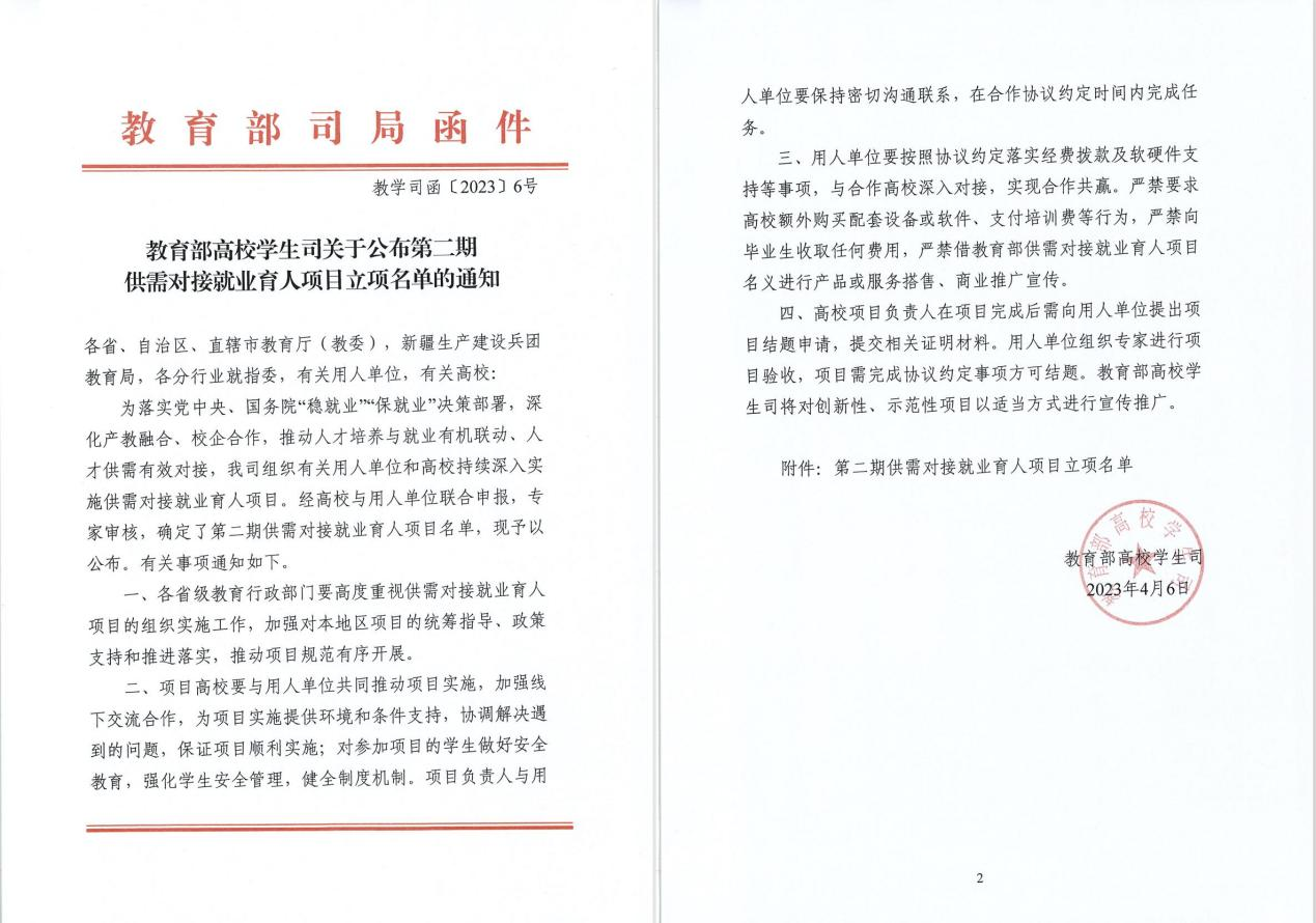 4月6日,教育部高校员工司发布《教育部高校员工司关于公布第二期供需对接就业育人项目立项名单的通知》(教学司函〔2023〕6号),公司2个就业实习基地项目获教育部批准立项。