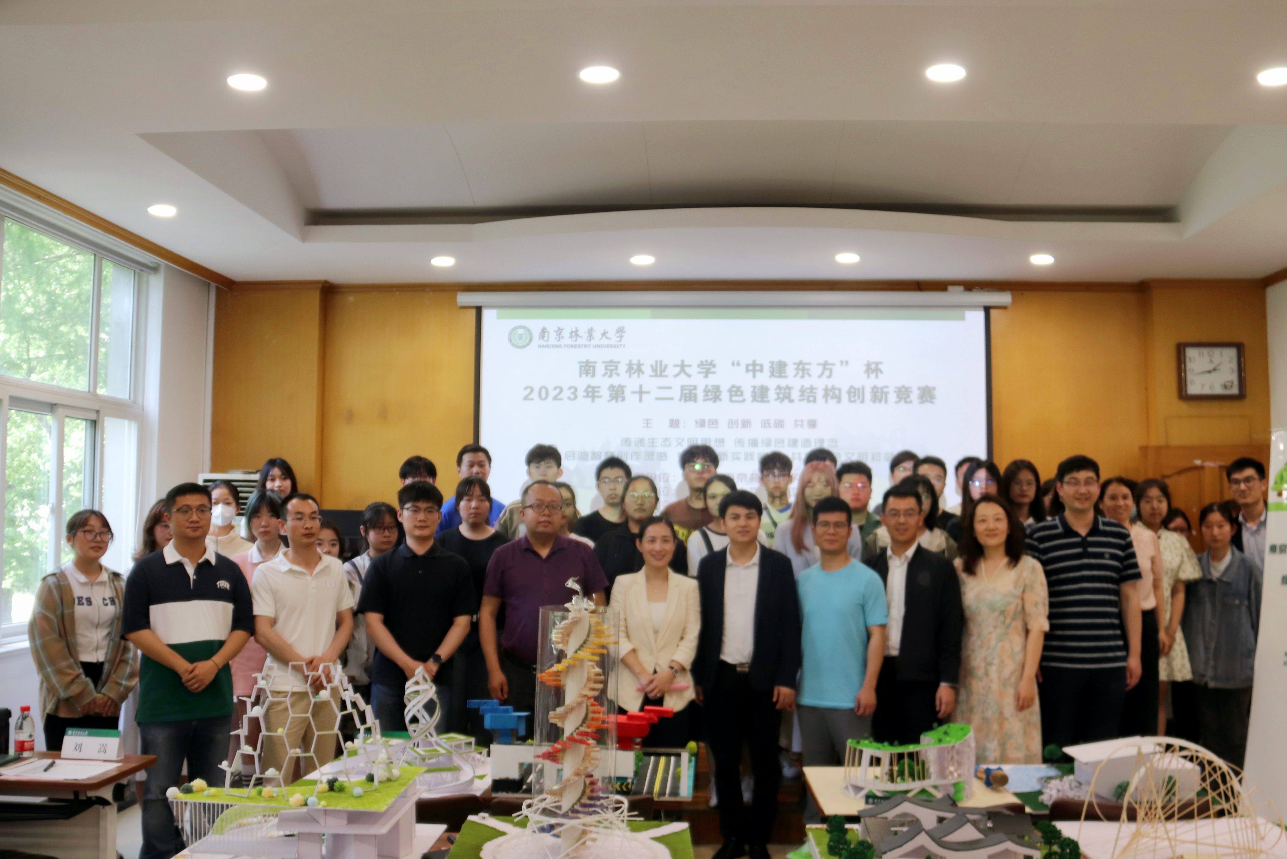 本次竞赛的主题是“绿色、创新、低碳、共享”。参赛作品模型为建筑以及桥梁,其结构形式和使用材料不限,作品要求与艺术结合,突出“绿色建造”理念,且每组作品团队成员不超过3人。活动分为两个阶段进行。第一阶段为设计作品展出环节。在校园林机楼东侧世界首座互承式竹集成材桥梁结构的巨大模型旁,本部和淮安两校区的45件参赛作品依次排开,向参观者展示每个建造模型,参赛队员与现场参观者交流互动,讲解创作理念以及运用的专业知识。最终,由大众评委评选出“最佳人气奖”作品。