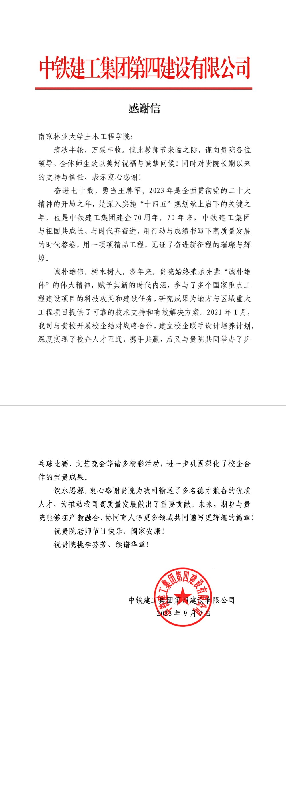 【第39个教师节】中铁建工集团第四建设有限公司向公司发来感谢信